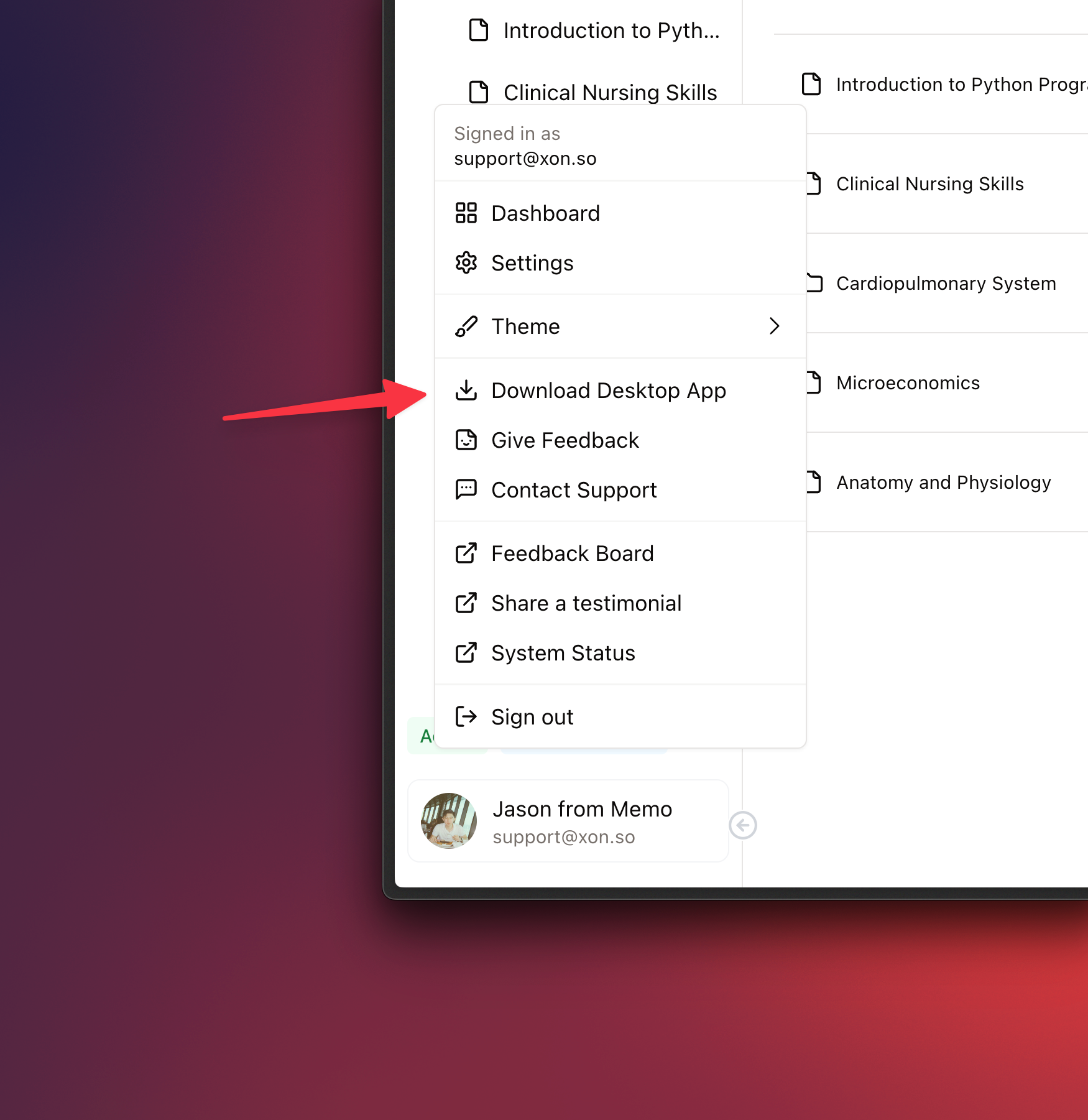 You can download these apps which are available at memo.cards/download or via the profile dropdown menu at the bottom left corner and selecting Download Desktop app.