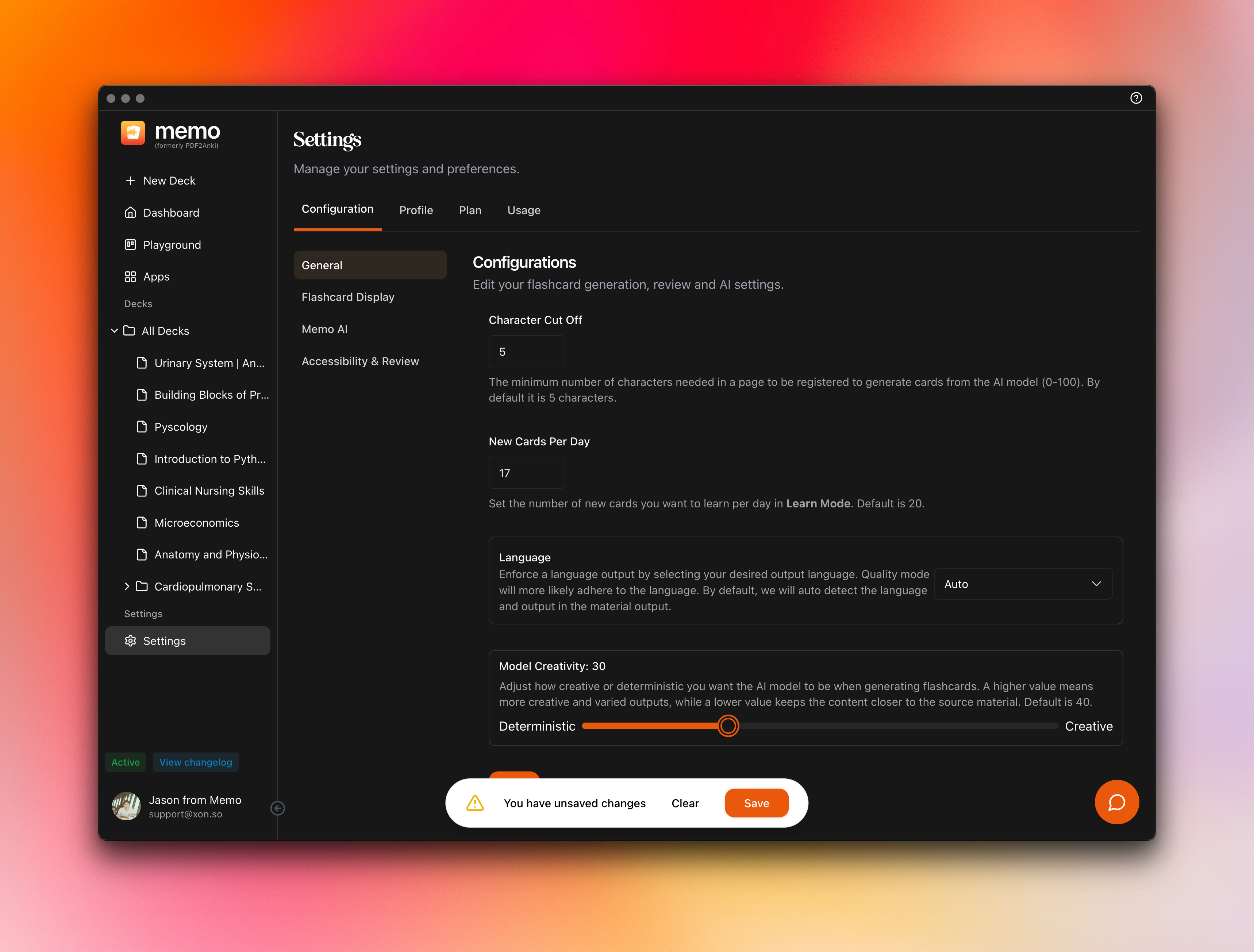 Settings configuration has been redesigned completely and split into 4 tabs: General, Flashcard Display, Memo AI and Accessibility. This allows easier location as our settings expands over time.
