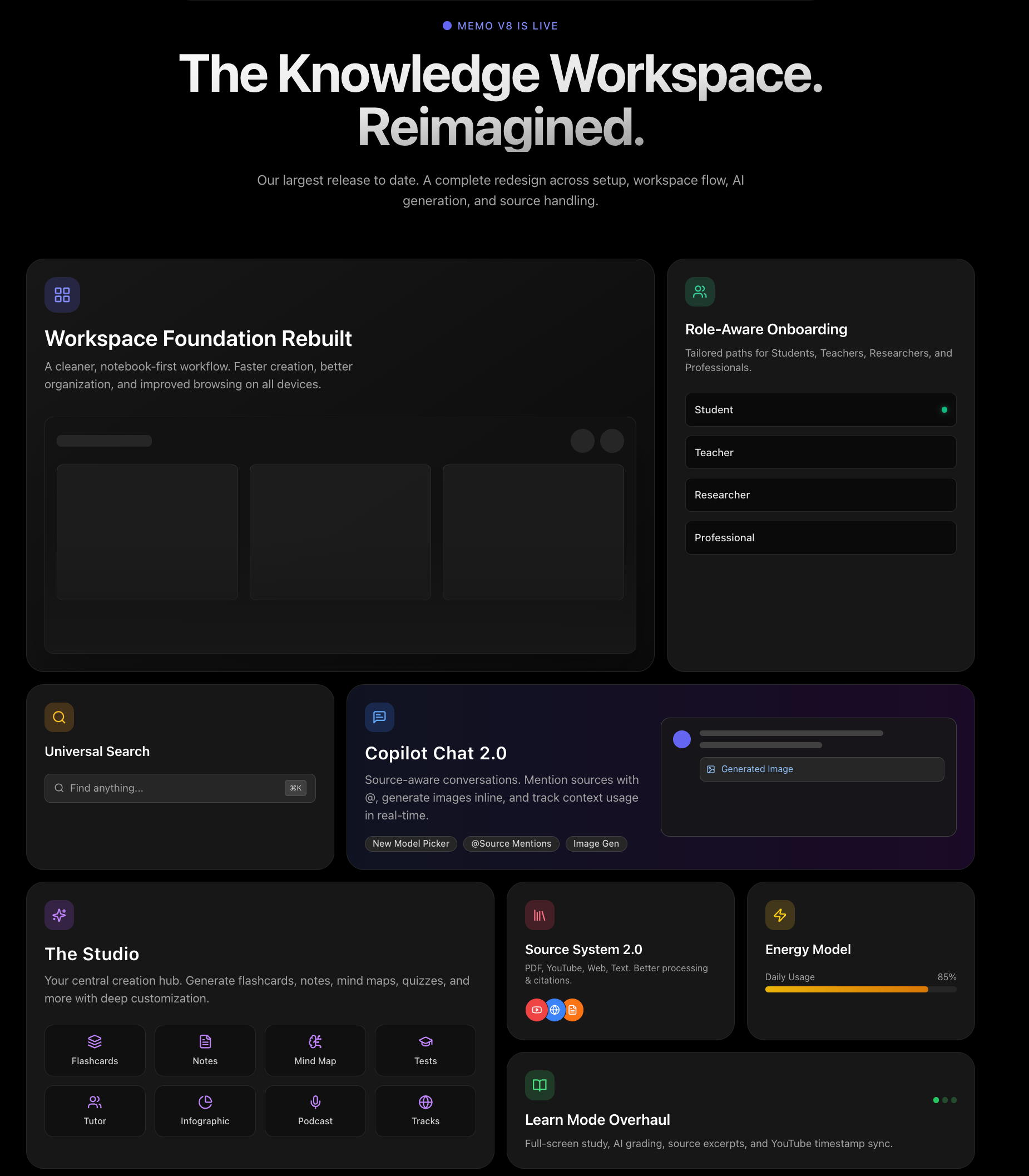 Memo 8.1 is the polish release for Memo 8. It is a broad update for students, researchers, educators, professionals, and knowledge teams who rely on Memo every day. The biggest headline is Skills: a new way to shape how Memo generates content. Around that, we also shipped a substantial quality pass across generation, review, source handling, exports, settings, and performance.