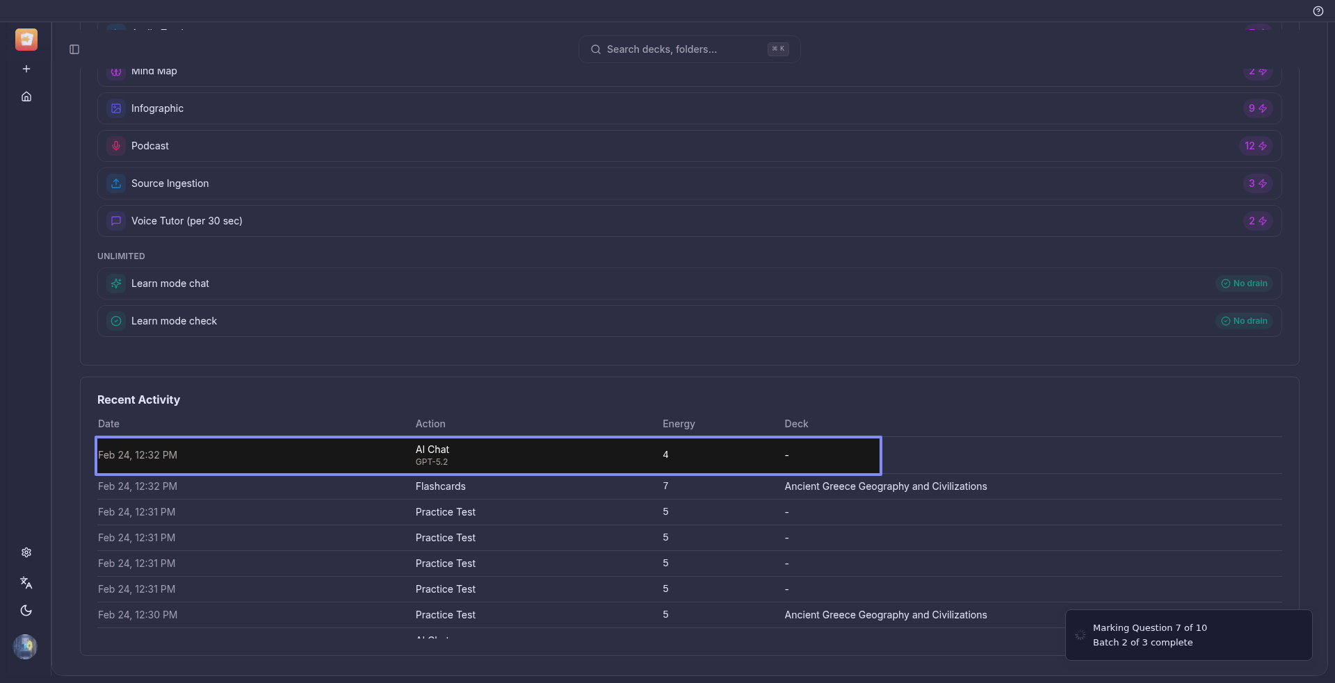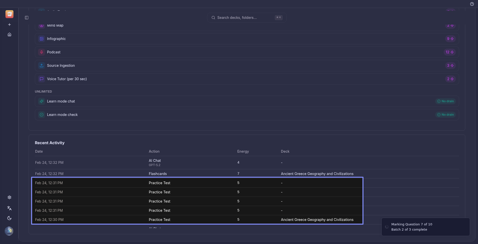 Thirdly, I only created one practise test but the system said I created 5 of them and used a lot of energy.
